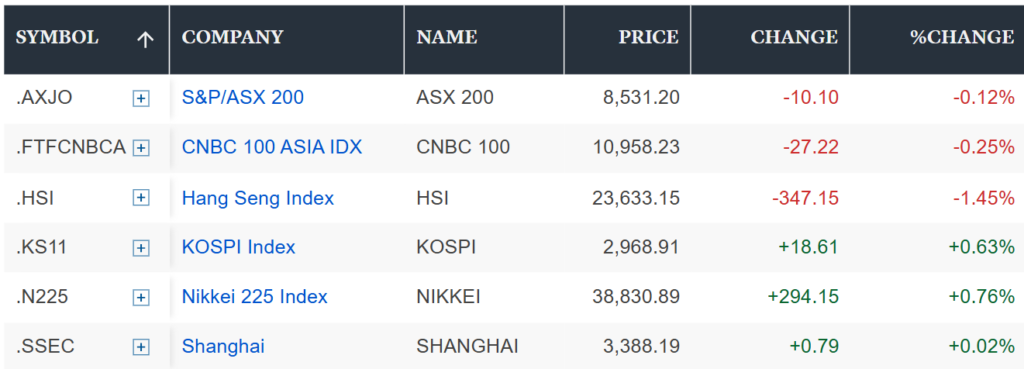 Hong Kong’s Hang Seng index lost 0.87%, and mainland China’s CSI 300 was up 0.18%.