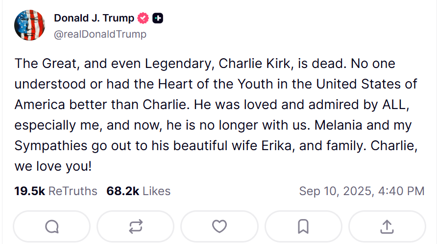 “The Great, and even Legendary, Charlie Kirk, is dead. No one understood or had the Heart of the Youth in the United States of America better than Charlie. He was loved and admired by ALL, especially me, and now, he is no longer with us,” Mr. Trump wrote on Truth Social. “Melania and my Sympathies go out to his beautiful wife Erika, and family. Charlie, we love you!”